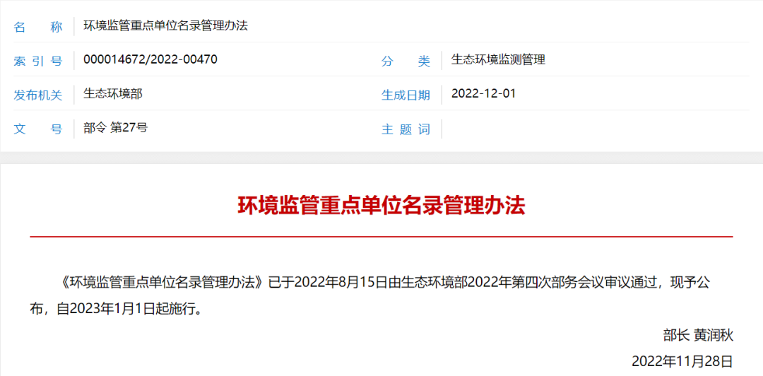 12月1日,生態(tài)環(huán)境部發(fā)布《環(huán)境監(jiān)管重點單位名錄管理辦法》(部令第27號),進一步明確了重點排污單位名錄的確定和發(fā)布。《辦法》將于2023年1月1日起施行。有哪些單位要被列為重點排污單位呢?省市兩級生態(tài)環(huán)境主管部門要承擔哪些職責呢?